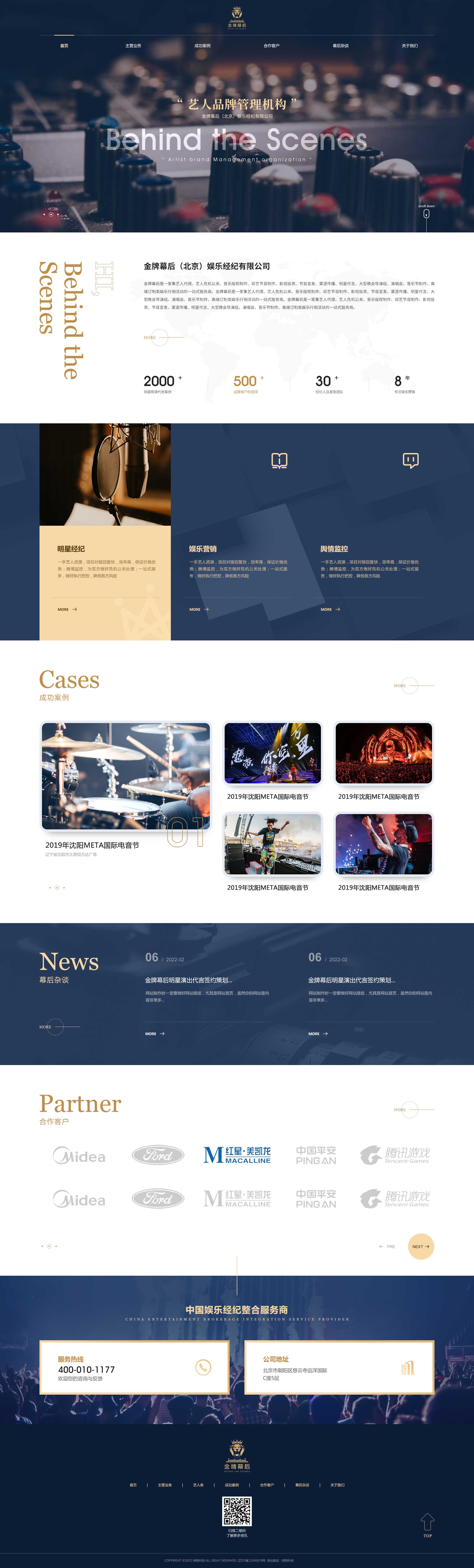 金牌幕后(Behind the Scenes),中國高端藝人品牌管理機(jī)構(gòu)。多年來,公司憑借著龐大的藝人資源,優(yōu)良的專業(yè)品質(zhì),高效的執(zhí)行能力和一流的品牌服務(wù),為近500家品牌客戶成功定制了超過2000個的專業(yè)項目,贏得了客戶的認(rèn)可,并和多家品牌客戶建立了長期的密切合作關(guān)系。